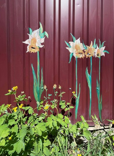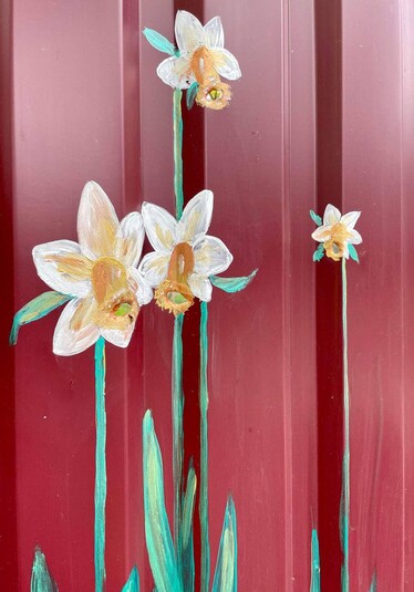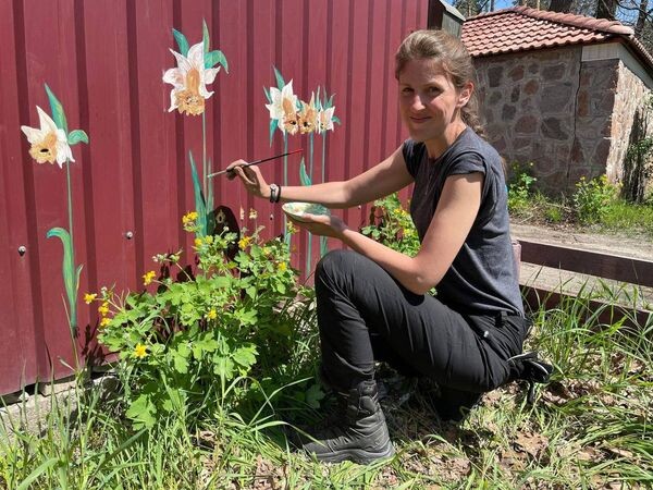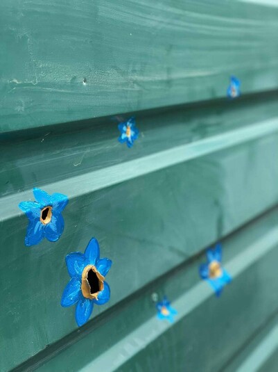 На парканах у Бучі «розвітли» місця від куль. Канадська художниця у такий спосіб прикращає місто після окупації, повідомляє Бучанська міськрада.