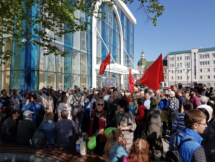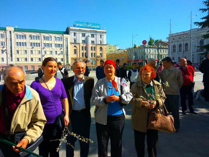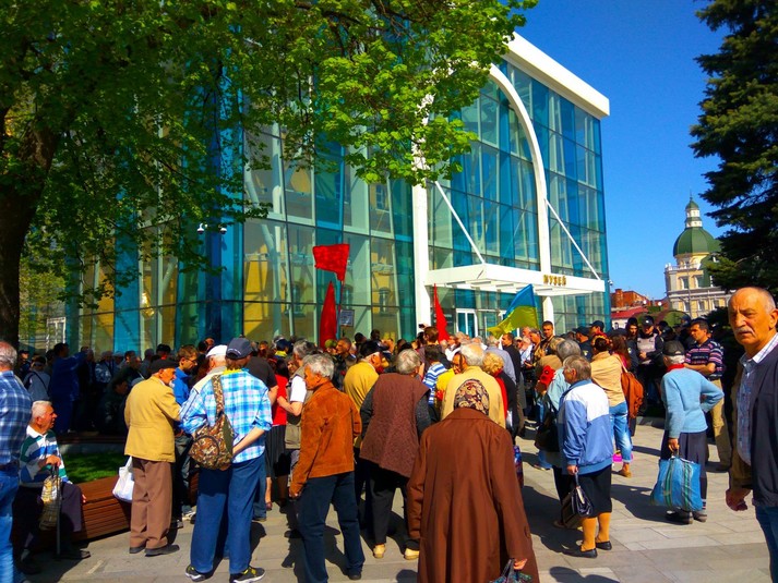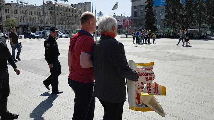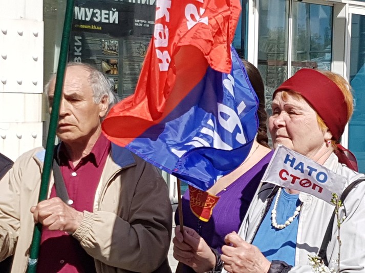 У Харкові на площі Конституції біля Історичного музею зібралася пара сотень в основному літніх людей, щоб відзначити Міжнародний день праці.