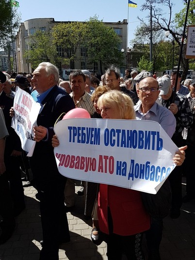 За інформацією очевидців, в руках деякі з учасників акції тримають червоні прапори (але без серпа і молота), прапорці з гаслом часів раннього Януковича «НАТО - стоп».