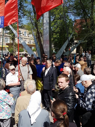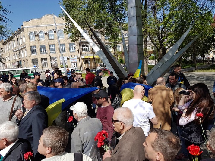 Через деякий час, після початку акції, до її представників підійшли проукраїнські активісти, які заблокували монумент, до якого учасники першотравневого мітингу хотіли покласти квіти.