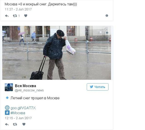 Незвичне для літа погодне явище спостерігали у центрі російської столиці. Зокрема, в районі Київського вокзалу і площі Європи.