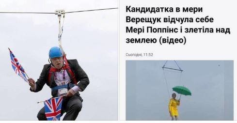 Кандидатка в мери Києва від партії «Слуга народу» Ірина Верещук, стала героїнею фотожаб після того, як в мережі з'явилися кадри зі зйомок її передвиборної реклами, де вона в жовтому плащі «літала» над столицею на зеленій парасольці.