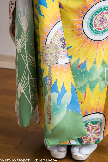 Виготовлено кімоно було майстром техніки фарбування шовку з використанням рослинних мотивів «Кага-юдзен». Японський пояс для кімоно «обі» виготовлено у Кіото. Для виготовлення кімоно знадобилося приблизно вісім місяців, поясу – три.