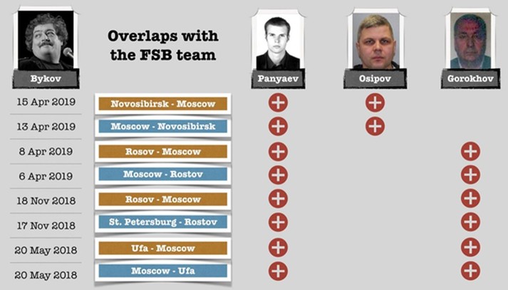 Отже, 13 квітня о 9 ранку Дмитро Биков і Катерина Кевхішвілі приземлилися в Новосибірську, згодом заселилися в готель «Domina» на вулиці Леніна. До того моменту вбивці вже були в місті. Паняєв з Другої служби та Іван Осипов з «Лабораторії» прилетіли до Новосибірська напередодні ввечері (під іменами Володимир Алексєєв та Іван Спіридонов, відповідно). І якщо Паняєв міг бути тим, хто, за визначенням Путіна, «просто доглядає», то Осипов – людина вельми конкретного профілю. Він не лише сам працює в ФСБ, а й постійно телефонує співробітникам центру «Сигнал» (де, як було показано в попередніх розслідуваннях, працюють з нервово-паралітичними речовинами).