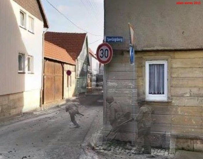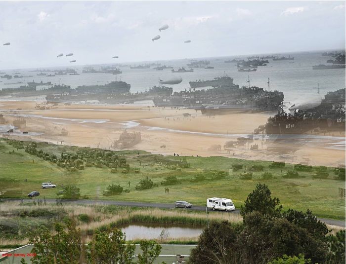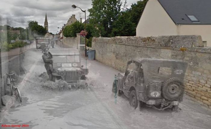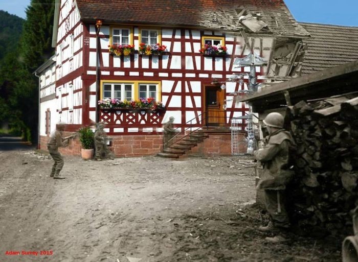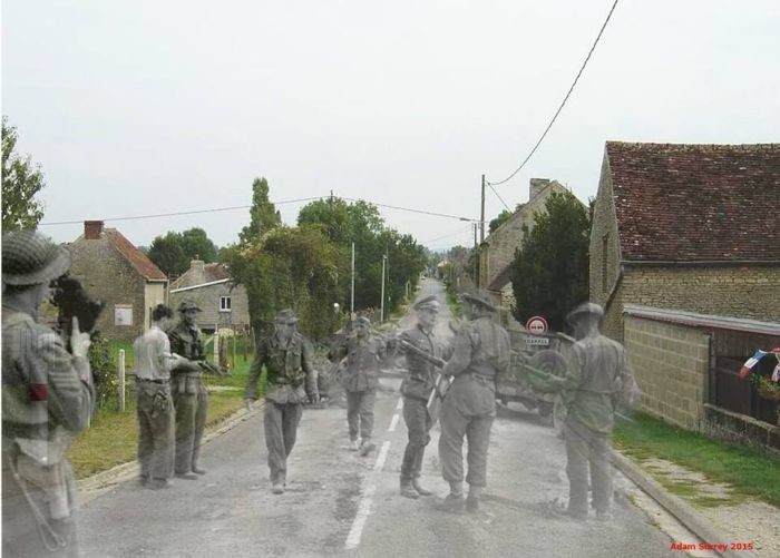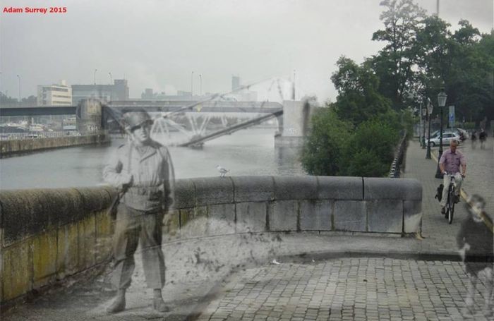 Фотограф Адам Суррей (Adam Surrey) поєднав старі військові знімки, зроблені в 1944 році на Західному фронті, з сучасними фотографіями цих місць, і ось, що у нього вийшло.