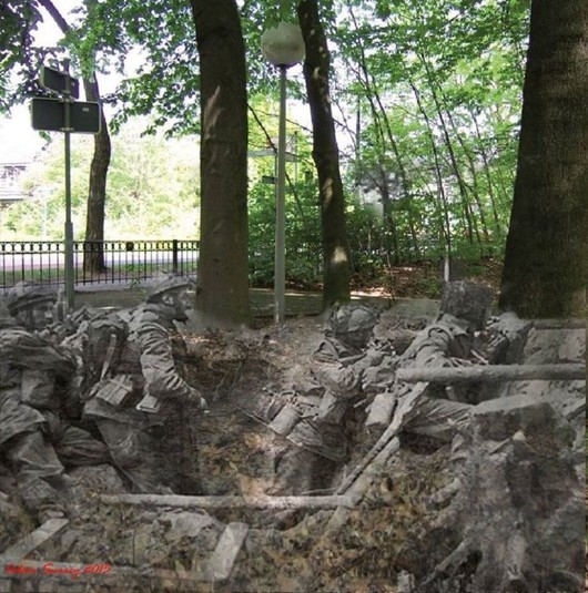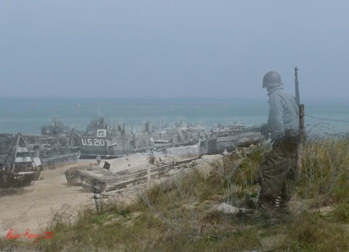 Фотограф Адам Суррей (Adam Surrey) поєднав старі військові знімки, зроблені в 1944 році на Західному фронті, з сучасними фотографіями цих місць, і ось, що у нього вийшло.