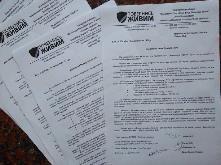 «Для старту ми відправимо десять листів таким е-декларантам: депутатам від БПП Ігорю Кононенку та Богдану Дубневичу, представнику «Народного фронту» Ігорю Котвіцькому, лідеру «Радикальної партії» Олегу Ляшку, депутату Опозиційного блоку Нестору Шуфричу, представнику групи «Відродження» Віталію Хомутинніку і Олесю Довгому з групи «Воля народу», безфракційному Сергію Таруті, а також міністру внутрішніх справ Арсену Авакову і міському голові Харкова Генадію Кернесу», – повідомили волонтери та ветерани АТО.