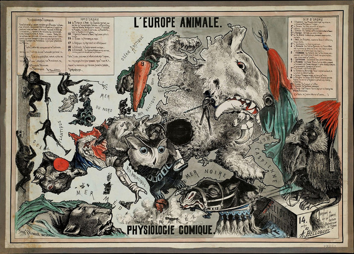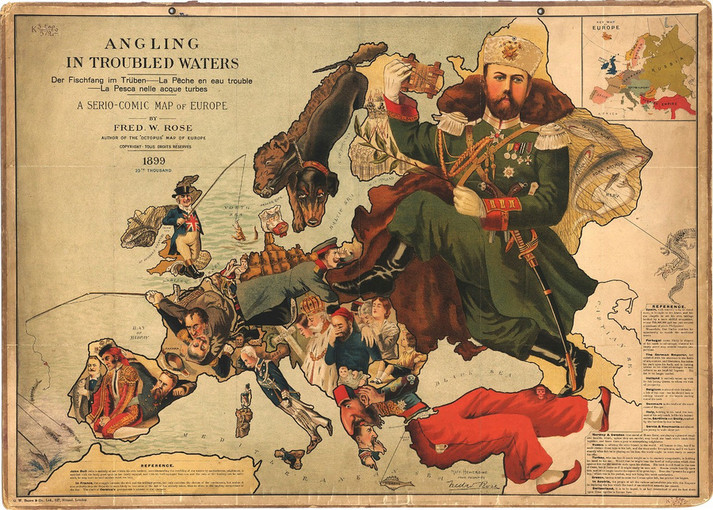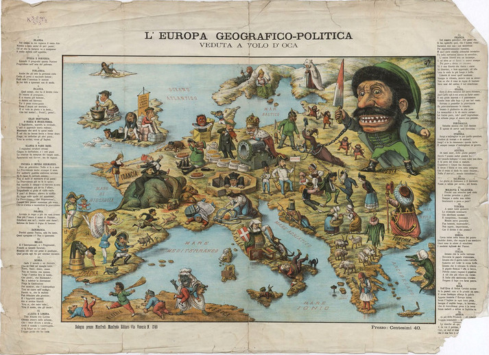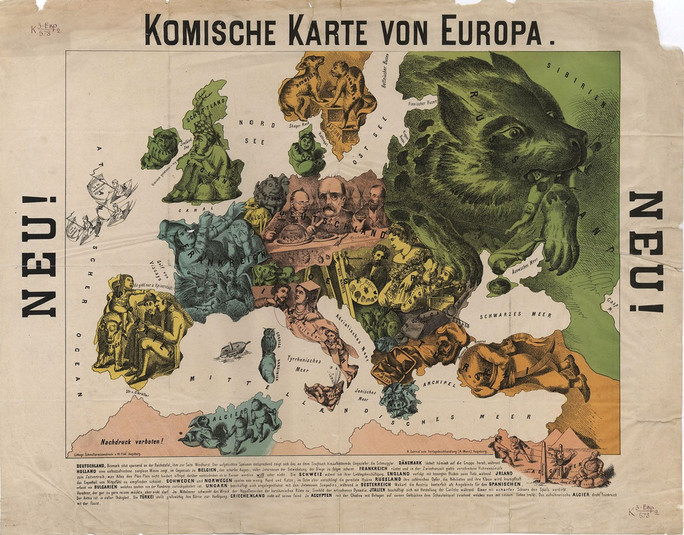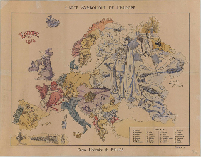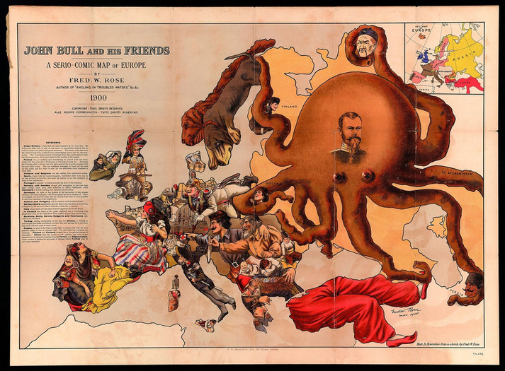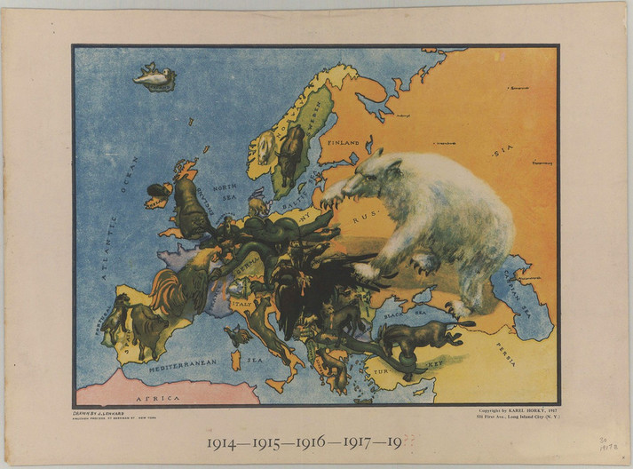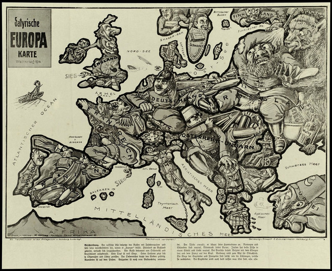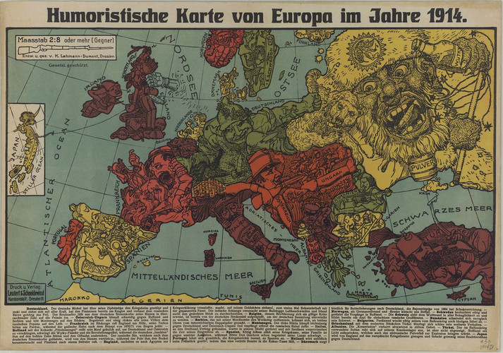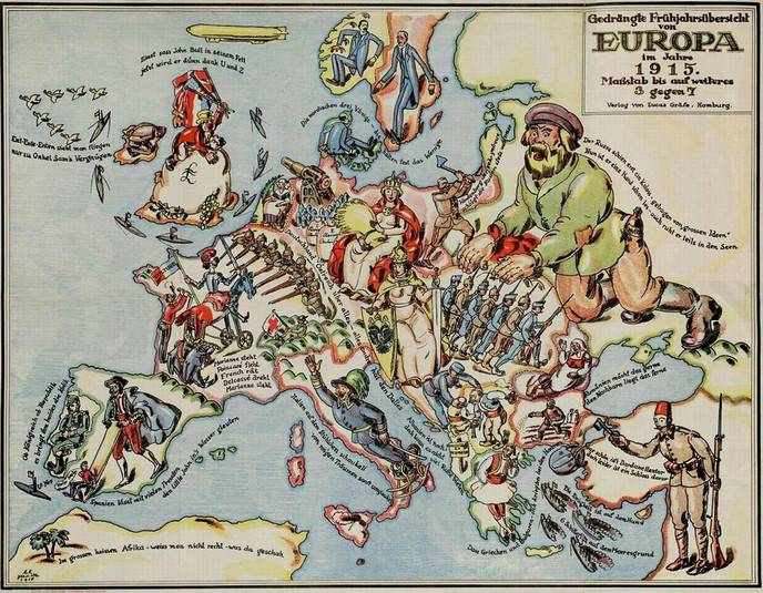 Ці карти створювалися в Європі задовго до Першої світової війни і під час неї. Цікаво відстежувати, в якому образі представляли ту чи іншу країну в різні періоди часу.