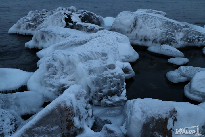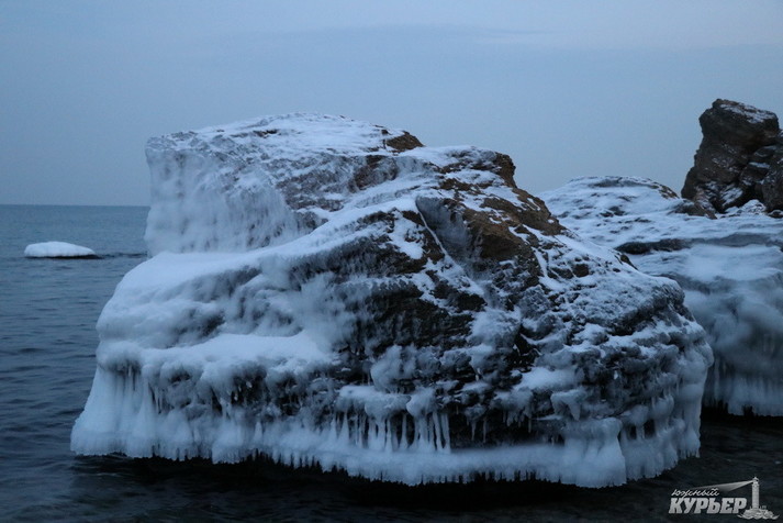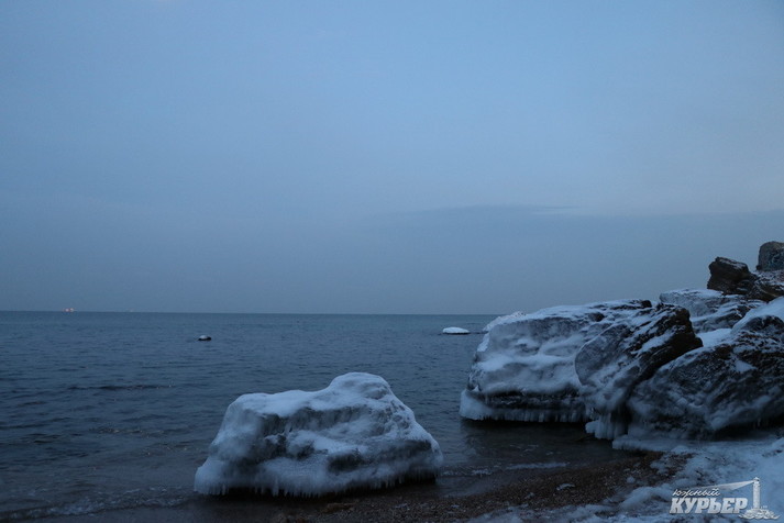 Море вздовж узбережжя вкрилося крижаною кіркою. Камені на узбережжі Чорного моря також вкрилися льодом і бурульками, інформує «Одесский курьер».