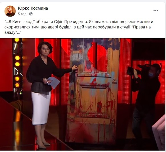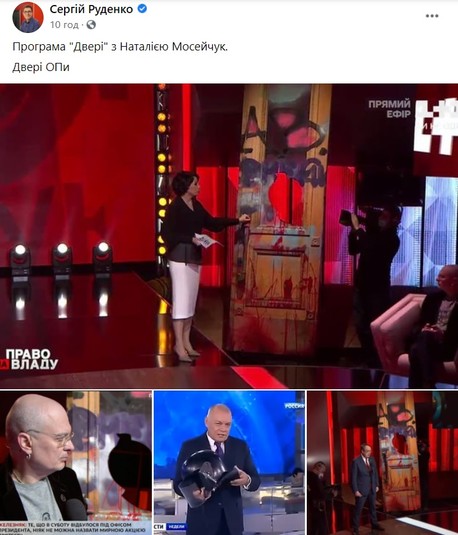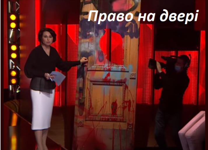 До студії програми «Право на владу» на каналі «1+1» 25 березня принесли двері будівлі Офісу президента, які було пошкоджено під час протестів 20 березня.
