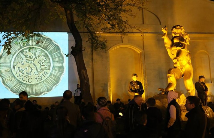 Під час події на стіні позаду монументу проектували слайди з фотографіями січових стрільців. А наприкінці учасники переглянули короткометражний фільм про події 1918 року.