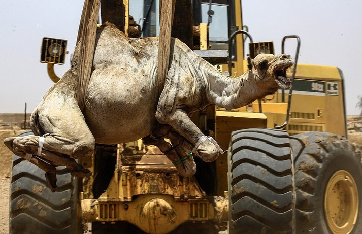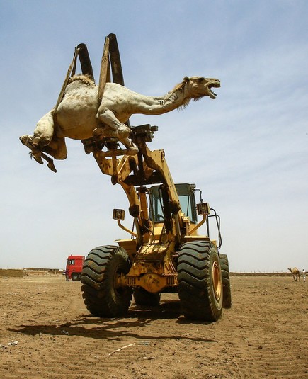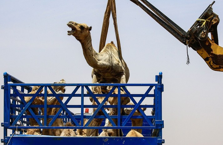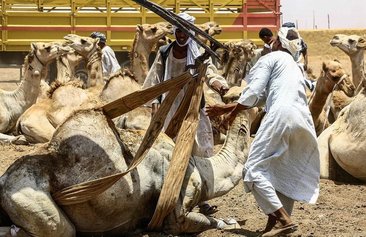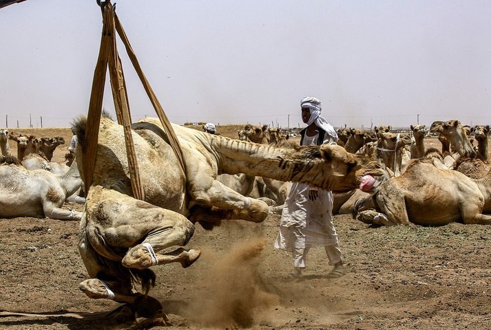 Торговці з усього Судану збираються на ринок верблюдів Ель Моліх в Омдурмані, щоб купити або продати верблюдів. Для перевезення тварин, торговці зв'язують верблюдів і використовують мобільний навантажувач, щоб підняти їх в кузов вантажівки.