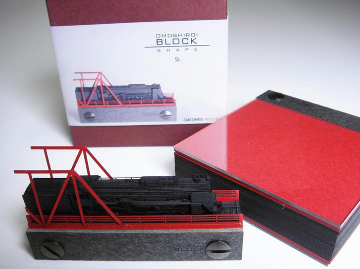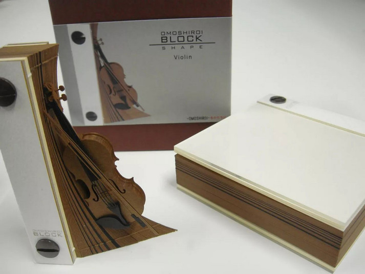 Omoshiro Block - блокнот для заміток з відривними сторінками, який під час використання перетворюється на мініатюрний витвір мистецтва: паперову скульптуру у вигляді буддійського храму, скрипки, потяга, рояля або фотоапарата.
