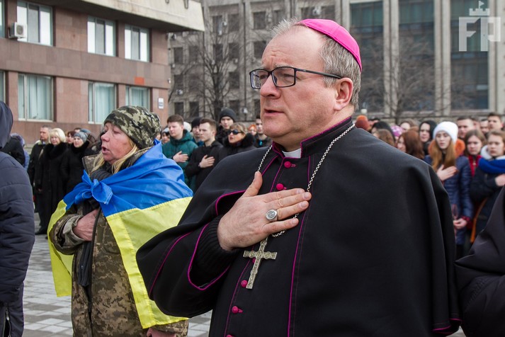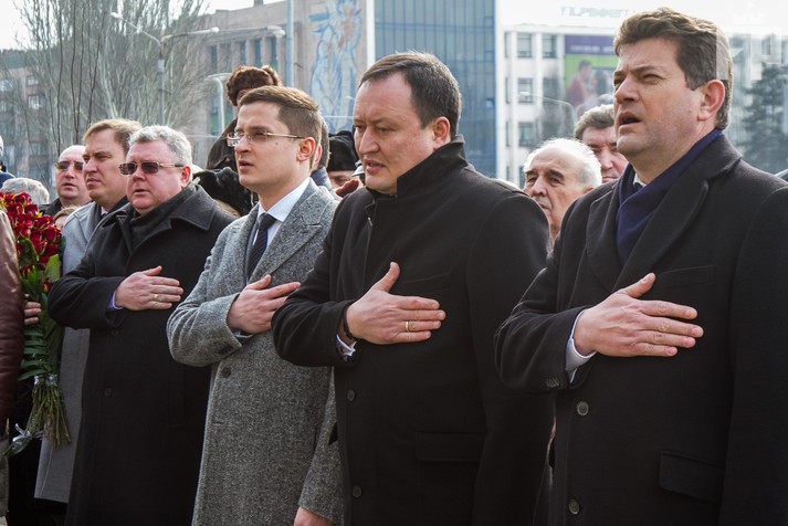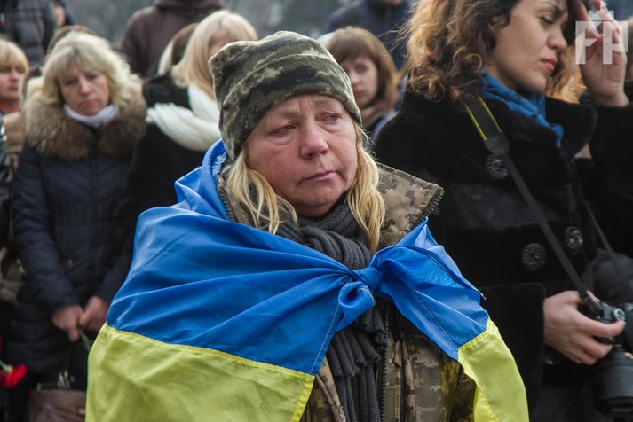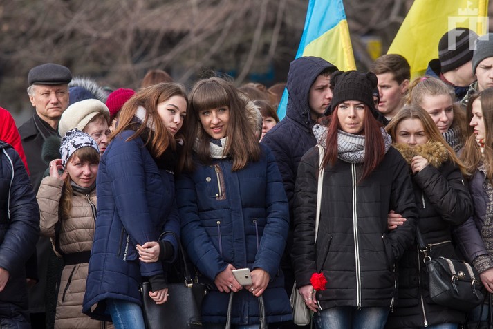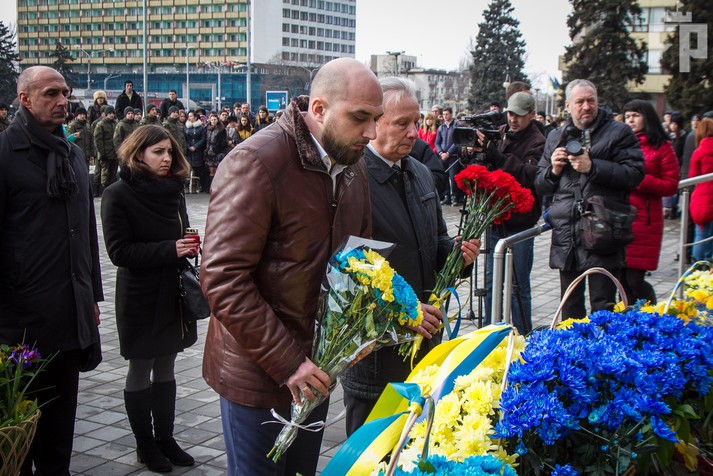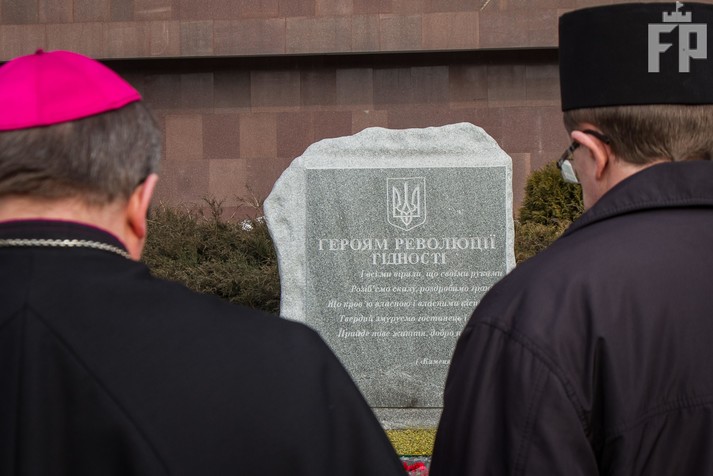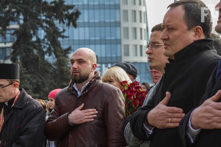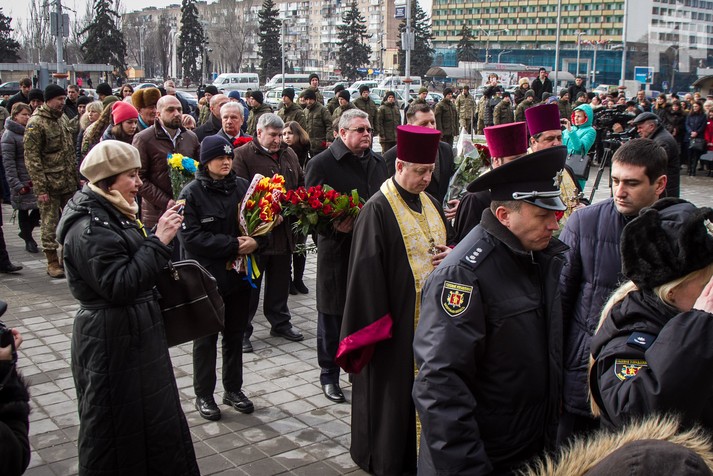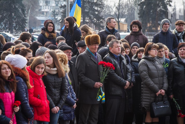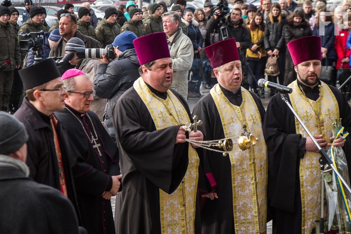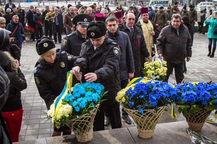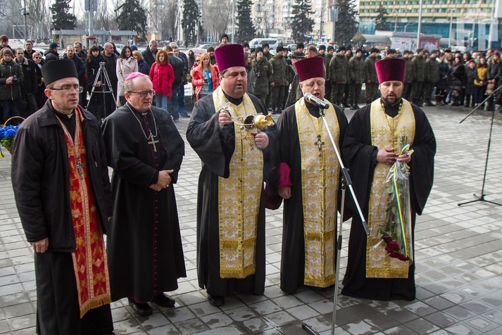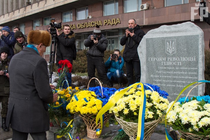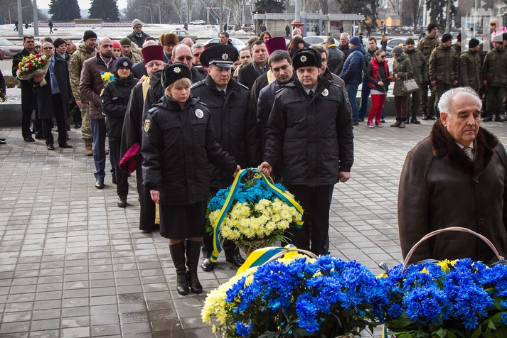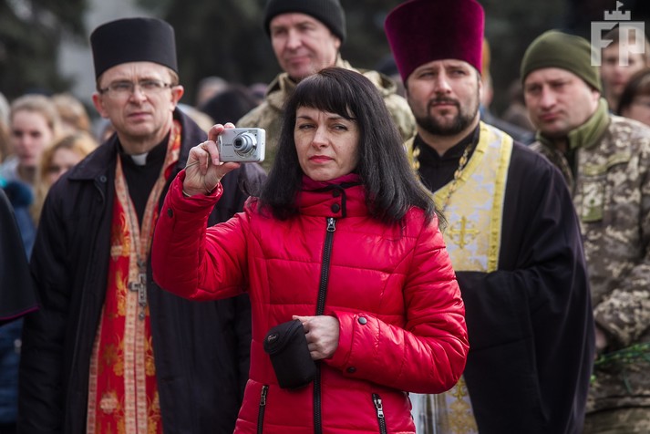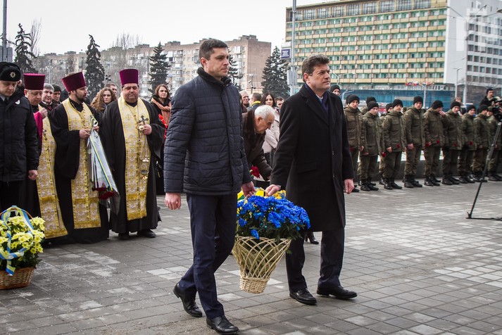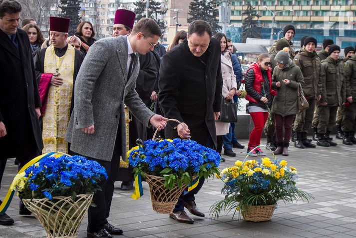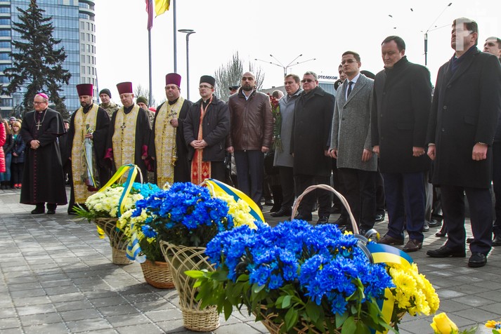 На площі Героїв Революції Гідності зібралися сотні городян – керівництво міста і області, військові, волонтери, силовики, активісти. Священнослужителі різних конфесій провели молебень, після чого присутні вшанували пам'ять загиблих хвилиною мовчання