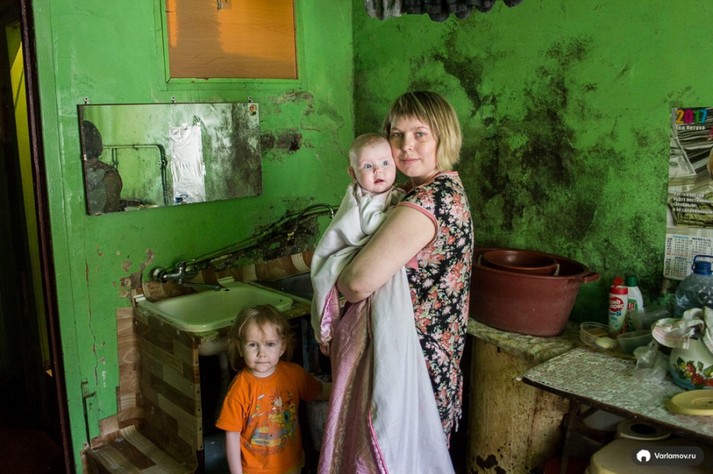 «Тут, в 11 квадратних метрах, уже п'ять років мешкає мати-одиначка Маша і її троє дітей. Цієї зими в квартирі у Маші відійшла стіна. Налякані жителі викликали МНС, але ті нічого надприродного не виявили. Через затоплений підвал відсирів гіпсокартон, і міжкімнатна перегородка відійшла. Комісія оглянула все і поїхала: сказали: «Ваша особиста власність – ремонтуйте самі». Йти Маші нікуди, іншого житла немає, іпотеку одинокій матері з трьома дітьми ніхто не дасть».