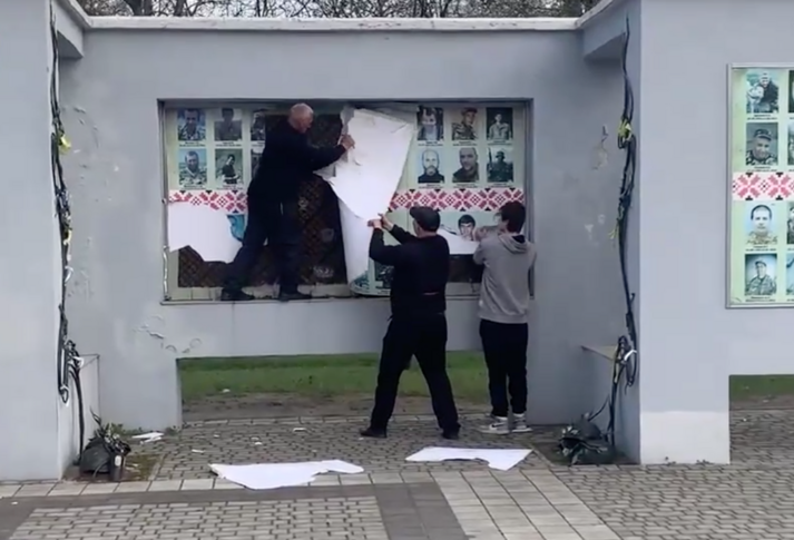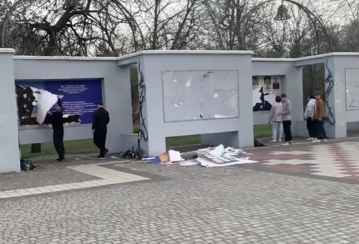 Невідомі зірвали прапор Європейського Союзу, потрощили панелі з фотографіями Небесної Сотні та загиблих у російсько-українській війні. Крім цього, окупанти знесли державний прапор України.