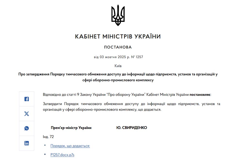 На початку жовтня цього року Кабінет міністрів ухвалив постанову про затвердження Порядку тимчасового обмеження доступу до інформації щодо підприємств, установ та організацій у сфері оборонно-промислового комплексу. Згідно з документом, підприємства оборонки, які мають статус критично важливих для економіки країни, можуть звернутися до Міноборони із письмовим запитом про блокування інформації, яка їх стосується і оприлюднена у публічних електронних реєстрах та на електронних інформаційних ресурсах. Таке обмеження діятиме до скасування або припинення воєнного стану.