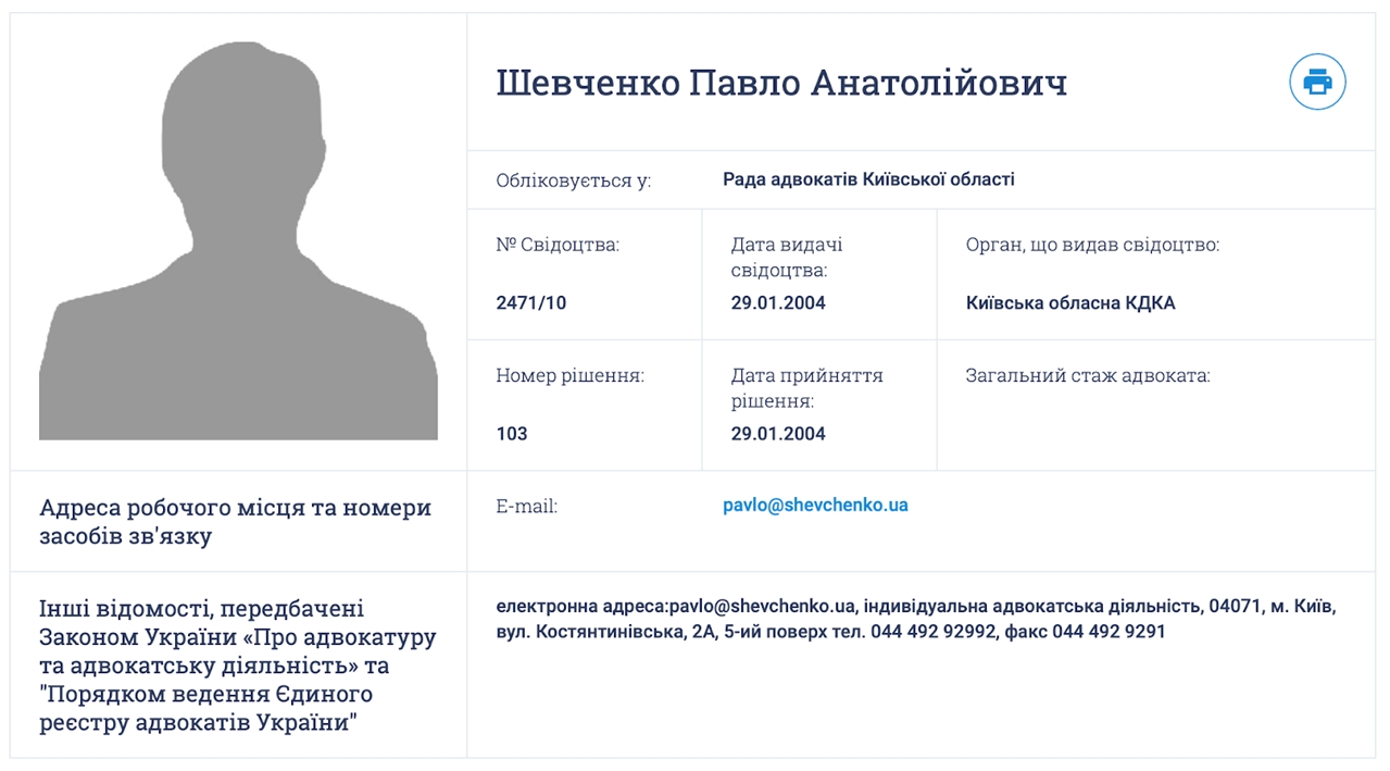 За цією ж адресою свою адвокатську діяльність веде і згаданий Павло Шевченко.