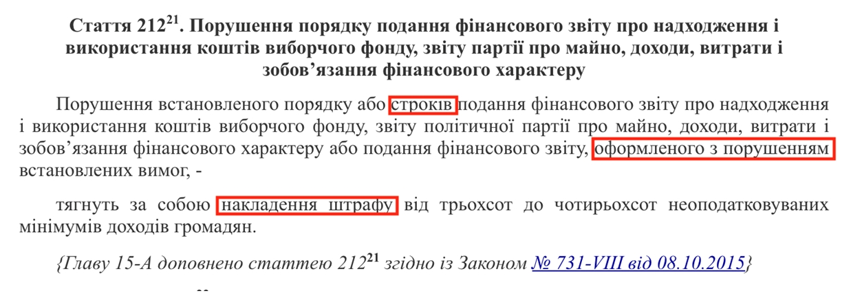 Відповідальність за неподання звітів формально існує – штраф складає від 5 до 7 тис. грн. Однак для багатьох політичних сил це може бути невеликою платою, що дозволяє приховувати джерела більш суттєвих надходжень та витрати.