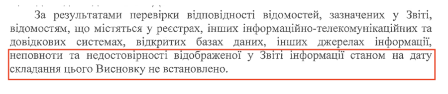 НАЗК не виявило недостовірності звіту під час перевірки 2024 року, про це йдеться у висновках, опублікованих на офіційному сайті.