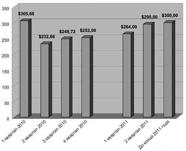 Цена природного газа для Украины в первом квартале 2011 года составила около $264 за тысячу кубометров, а во втором квартале — примерно $295 за тысячу кубометров. Средняя цена за 2011 год составит $300 за тысячу кубометров.