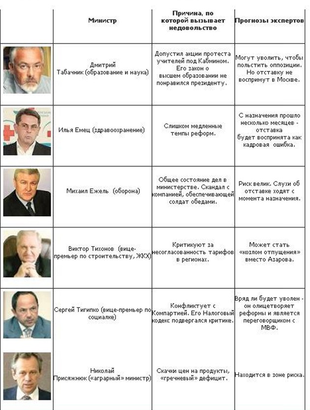 Политолог выделяет «зону риска», в которой оказались сразу несколько министров: обороны - Михаил Ежель, здравоохранения - Илья Емец, образования - Дмитрий Табачник. Кроме них в списке два вице-премьера: Виктор Тихонов и Сергей Тигипко.