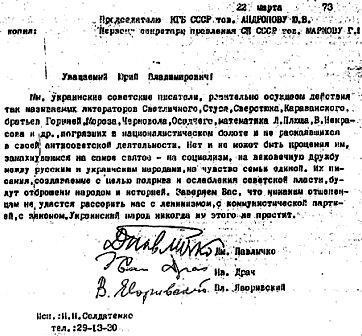 Мы, украинские советские писатели, решительно осуждаем действия так называемых литераторов Светличного, Стуса, Сверстюка, Караванского, братьев Горыней, Мороза, Черновола, Осадчего, математика Д. Плюща, В. Некрасова и др., погрязших в националистическом болоте и не раскаявшихся в своей антисоветской деятельности. Нет и не может быть прощения им, замахнувшимся на самое святое - на социализм, на вековечную дружбу между русским и украинским народами, на чувство семьи единой. Их писания, создаваемые с целью подрыва и ослабления советской власти, будут отброшены народом и историей. Заверяем Вас, что никаким отщепенцам не удастся рассорить нас с ленинизмом, с коммунистической партией, с законом. Украинский народ никогда им этого не простит.