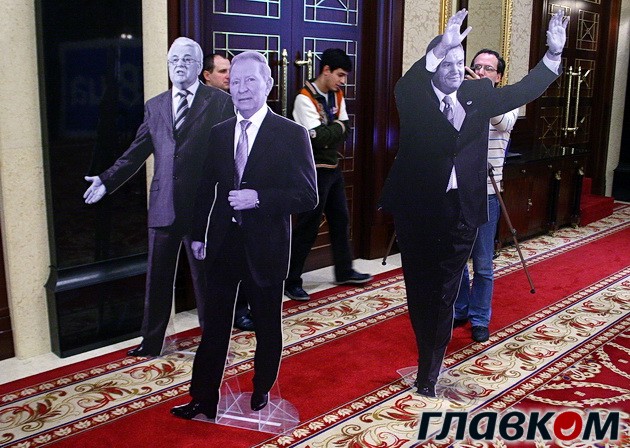 После небольшой раздачи «слонов» собственник издания - Вадим Омельченко - позвал на импровизированную сцену всех сотрудников издания, чтобы, как говорится, народ знал в лицо всех «героев». К слову, рядом с реальными героями находились и их бумажные прототипы. И не только Сони и Олега. Если администрация Российской Федерации совсем недавно заказала себе оловянного Януковича, то LB изготовил себе бумажных президентов – Януковича, Кучму и Кравчука. Причем, в полный рост. А вот Виктора Ющенко – ни вживую, ни картонного – почему-то не оказалось. Что бы это могло значить? Зато в противоположном углу стояла фигура Арсения Яценюка - реквизит с 2009 года – с тех времен, когда еще газета «Левый берег» отмечала свой день рождения.