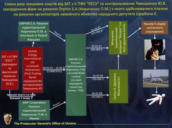 По данным, предоставленным Кузьминым в ЕП, деньги за убийство депутата Евгения Щербаня перечислила фирма Somali Enterprises, которая, согласно данным его выступления, перечисляла Тимошенко деньги на приобретение шуб, драгоценностей, автомобилей, оплату гостиниц, ресторанов и прочего. То есть, Генпрокуратура выстроила цепочку: Лазаренко – Тимошенко – убийцы Щербаня. Даже беглый взгляд на сумму, которая ушла на оплату этого преступления, вызывает множество вопросов, ведь в те годы 3 млн. долларов – сумма, за которую можно было нанять армию киллеров, которые бы устроили сафари по терриконам за всеми донецкими чиновниками вместе взятыми. Если же серьезно, то буквально недавно в США СБУ был допрошен один из ключевых фигурантов дел Тимошенко и Лазаренко Петр Кириченко. Его имя фигурирует в схемах, которые Кузьмин показывал европейцам. Однако в пятницу замгенпрокурора, так и не сказал, подтвердил ли Кириченко в ходе допроса причастность Тимошенко к убийству Щербаня. Правда, Ренат Кузьмин вновь посетовал на американцев, из-за которых никак не получается допросить Лазаренко (как будто Павел Иванович будет на себя наговаривать). Исходя же из того, что последние звенья «криминальной цепочки», выстроенной ГПУ – посредник, контактировавший с киллером, днепропетровский авторитет Мильченко («Матрос») и главарь донецкой банды Кушнир мертвы – позиция следствия выглядит так, что Тимошенко могут ко всему прочему впаять еще и организацию убивства. Все равно свидетелей либо нет в живых, либо они будут молчать. Удобно для того, чтобы Юля была не только «воровкой», но и «заказчицей резонансного убийства». Пускай это и не доказуемо…