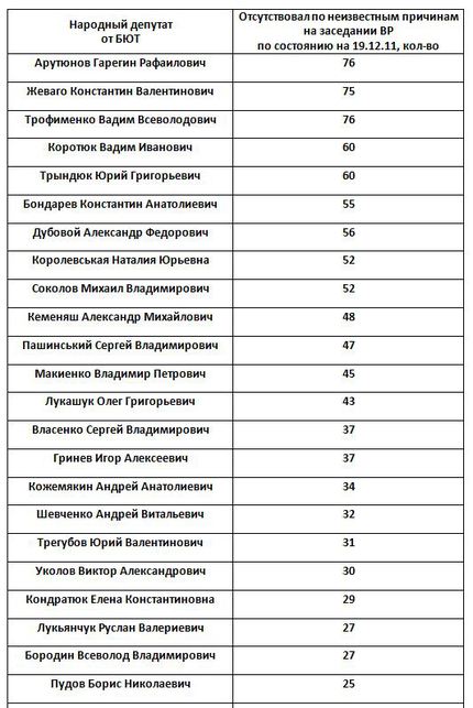 Может быть, кто-то и скажет в оправдание бютовцев, что они находились на громких судебных процессах, в частности по делу Юлии Тимошенко. Вероятно, отчасти так и было. Но для чистоты анализа я пользовался только техническими данными – «голой официальной цифрой». Опять-таки: в таблице представлено только часть депутатов, остальные, у которых данные непосещения поменьше учтены при подсчете общей картины по фракции.