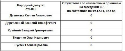 Количество постоянных «заседателей» в БЮТ не такое уж и большое, но они также присутствуют. Я также подсчитал количество всех «відсутніх» на сумму пропущенных заседаний – вышел коэффициент – 1837 заседаний.