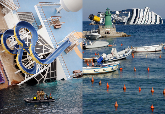 Водолазы ищут людей на затопленном судне. Удалось спасти двух корейских молодоженов, которые не слышали ни удара, ни тревоги. Оказавшись запертыми в кабине, они сутки ждали помощи. Спасли и комиссара лайнера Маррико Джампетрони, который руководил эвакуацией, спас многих людей и, проверяя один из салонов, упал, скатился и сломал ногу (его уже называют героем). Водолазы исследуют каждую затопленную каюту. Пока нашли 6 погибших, 16 человек (6 членов экипажа и 10 туристов) числятся пропавшими без вести. Говорят, что на судне слышны посторонние звуки, поэтому есть надежда найти кого-нибудь еще живыми.