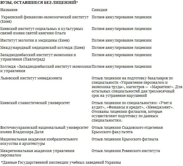 Госкомиссия аннулировала лицензии шести институтов и университетов, еще пяти — запретила готовить специалистов по определенным специальностям. В основном «чистка» коснулась частников. В «черный список» попали всего два вуза с национальным статусом. Однако чиновники утверждают, что форма собственности в данной ситуации не имеет значения. Проблема в низком качестве обучения, слабом преподавательском составе и отсутствии в институтах туалетов.
