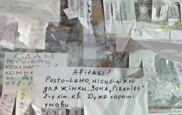 Жiнки розбалакалися. А через кiлька хвилин знайома почала телефонувати до своїх подруг i питати, чи не чули про якусь роботу. Навпроти «живого ринку безробiтних» - великi дошки з оголошеннями рiзного змiсту: про пошук роботи, винаймання лiжко-мiсця чи кiмнати в рiзних масивах, а ще про послуги перукаря, манiкурницi, швачки чи майстра з ремонту комп'ютерiв...