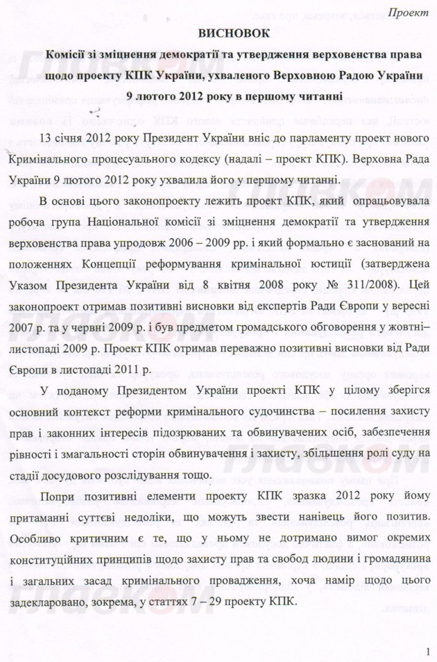 Пропонуємо вам ознайомитись з повним проектом висновку Комісії зі зміцнення демократії та утвердження верховенства права щодо проекту Кримінально-процесуального кодексу України.