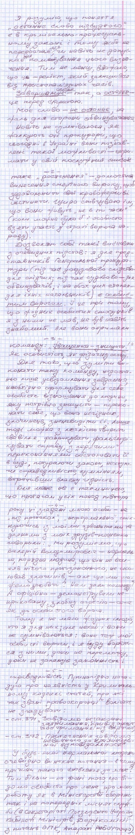 «Моє слово – не останнє, на жаль для сторони обвинувачення» - почав Іващенко. Він висловив припущення, що прокурори у його справі, певне, розчаровані тим, що не можуть добитись для нього смертного вироку і особисто взяти участь у його виконанні. Хоч він, Іващенко, і не розуміє, звідки у них така особиста до нього ненависть, оскільки із жодним із них він не був знайомий особисто. Іващенко розповів, що впродовж усього процесу у неформальній обстановці обвинувачувачі постійно висловлювали його адвокатам розуміння того, що Валерій Іванович порядна ні в чому не винна людина, але їм дали «команду», а це для них аргумент достатній, щоб стати непримеренним ворогом будь-кому. «Але нехай і вони не сумніваються: вони теж мої особисті вороги» - сказав Валерій Іващенко. Він нагадав «правоохоронцям» про існування у КПК статей 371 (завідомо незаконні затримання, привід, арешт або тримання під вартою) та 372 (притягнення завідомо невинного до кримінальної відповідальності).