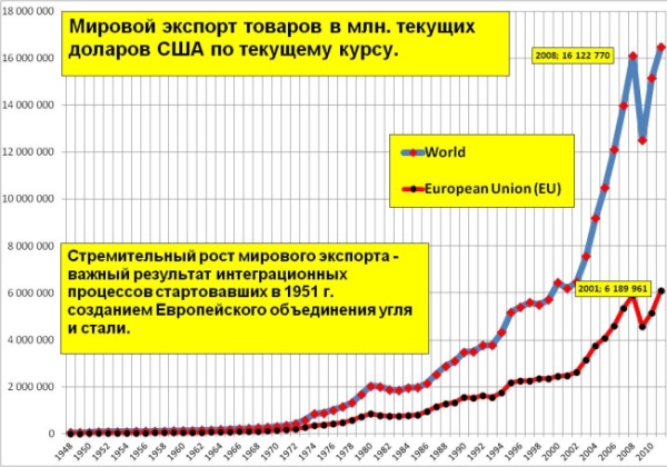 Стремительный рост мировой торговли (в которой формализуется стремление наций к сотрудничеству) весьма убедительно подтверждает важнейшую, цивилизационную, значимость выбранного уже более 60-ти лет назад по инициативе Франции пути развития человечества (см. График 1).