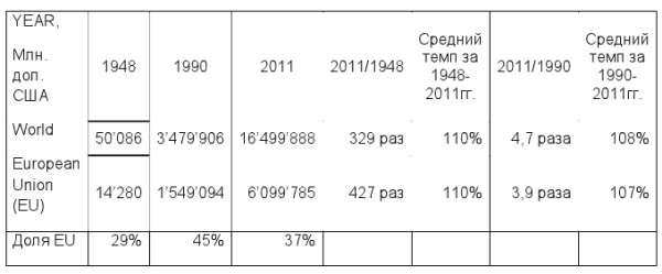 1. Мировой экспорт товаров вырос за 1948-2011 гг. в 329 раз, что обеспечилось высоким среднегодовым темпом роста - в 110%. Такого взлета не знает ни один важнейший показатель мирового экономического развития. Делаю ударение - ни один. Даже подпитываемое инфляцией номинальное значение мирового (глобального) ВВП растет с темпом, на несколько процентов меньшим;
