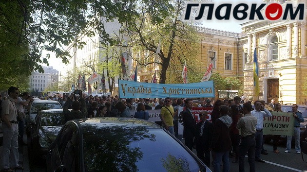 Пока колонна поднималась по Грушевского, все было тихо и мирно. Бабушки кричали «Юле, волю», свободовцы «Слава Украине!» и «Свобода прийде, порядок наведе». Коллеги по колонне косились, слыша такие речевки, но открыто никто не роптал. Первая проблема у демонстрантов возникла при подходе на Банковую. Во-первых, там как раз собрался митинг против гомосексуалистов, который перекрыл движение в сторону Администрации Президента. Во-вторых, перекрыли движение к Януковичу и милиционеры.
