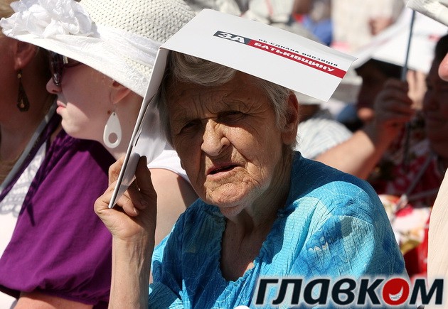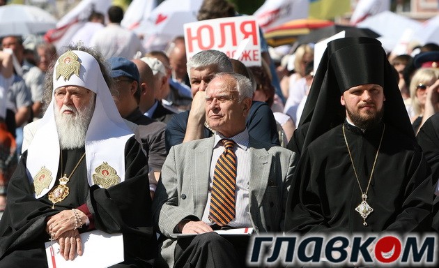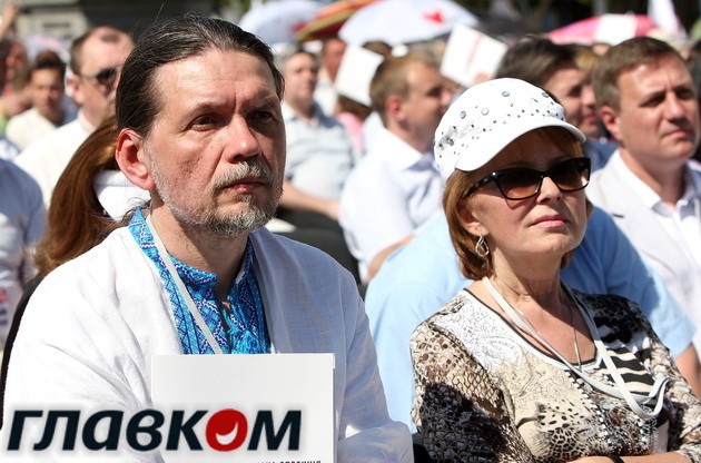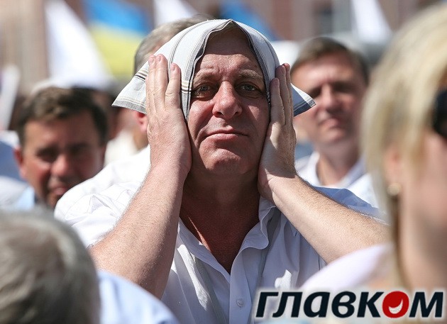 Зато большинство явно не учло, что придется полтора часа сидеть под палящим солнцем: в головных уборах были только «бютовка» Эллона Шишкина и «фронтовик» Роман Зварыч (оба - в бейсболках), и святые отцы. Александра Кужель ограничилась пляжным козырьком. Жене Тимошенко, Ирине Луценко и прочим видным личностям пришлось пожариться на солнцепеке. Впрочем, супруге Юрия Луценко мучиться пришлось недолго: ее в числе других лидеров партий вскоре вызвали на сцену – она официально представляла «Народную самооборону».