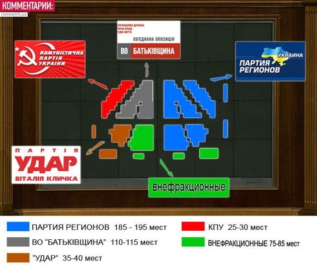Все остальные кандидаты по мажоритарным округам в большинстве своем будут представлять либо Партию регионов, либо лояльные к ней партии, либо же вообще будут самовыдвиженцами. Стоит отметить, что последних, по самым скромным расчетам, в седьмом созыве Верховной Рады будет до 80 человек. Очевидно, что некоторая их часть буквально в первый же день созыва сессии пополнит ряды фракции Партии регионов. Все остальные внефракционщики-мажоритарщики, скорее всего, разбредутся по различным фракционным группам по типу «Реформы ради будущего» .