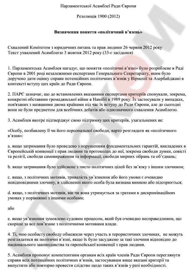 Враховуючи все це, після затвердження на найвищому рівні визначення «політичний в’язень» з відповідними чіткими критеріями, нічого не заважатиме в наступних резолюціях щодо України назвати речі своїми іменами. Не складно побачити, що ув’язнення Тимошенко й Луценка майже за всіма параметрами збігається з затвердженими критеріями ПАРЄ: це і порушення Європейської конвенції при ув’язненні, і політичні мотиви переслідування, а також заангажований судовий процес.