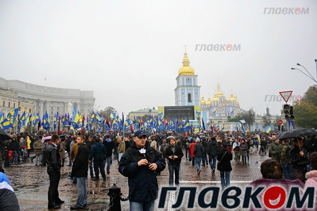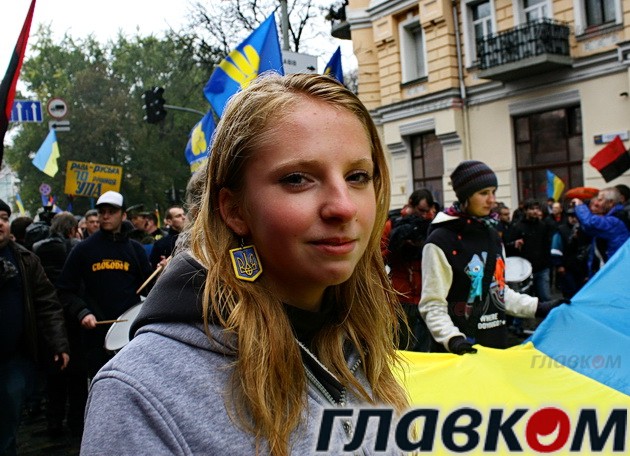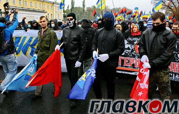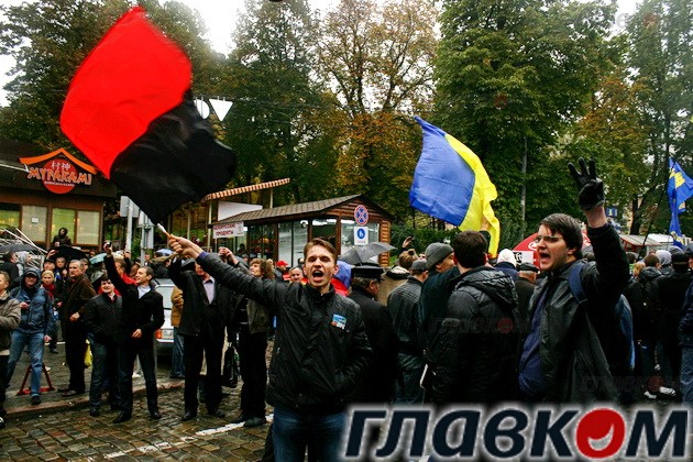 Началось мероприятие, на которое должно было собраться до двух десятков тысяч человек, под стенами Киевского Национального университета. Тут украинские националисты выстраивались в организованные колонны. С флагами и транспарантами. Повторяя патриотические речевки.