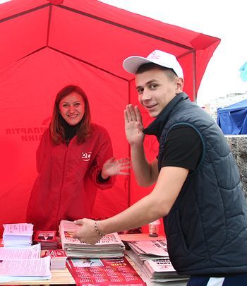 Такая взаимопомощь среди агитаторов - явление распространенное. И молодежь, и старики давно перезнакомились друг с другом, вместе проводят перерыв, пьют чай. Когда посетителей маловато, часто можно встретить желто-оранжевую болтающую парочку или опытную бабушку-агитаторшу в красном, которая «учит жизни» юную леди из палатки Королевской.