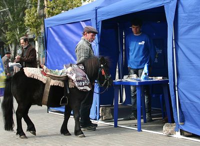 День агитатора начинается с установки палатки. Возможно, поэтому на каждой «точке» работает «дуэт» из представителей мужского и женского пола. Исключение составляет «Наша Украина», где трудятся только девушки. А конструкции палаток разные.