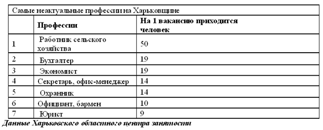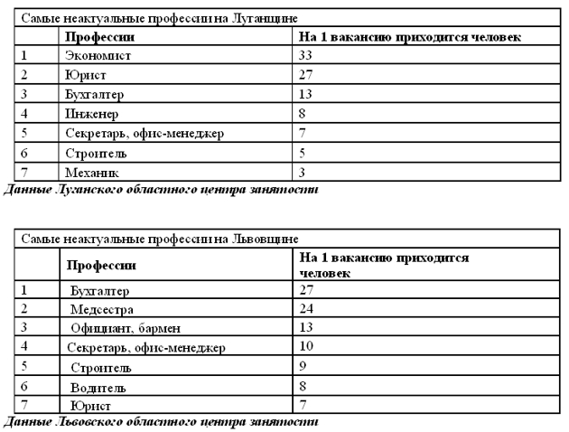 В качестве примера текущего состояния рынка труда можно привести ситуацию, сложившуюся в разных регионах страны. Например, на Востоке в Луганской и на Западе во Львовской области. И там, и там сегодня самая большая проблема найти работу у экономистов, юристов, бухгалтеров, секретарей, офис-менеджеров. На одну открытую вакансию приходится иногда более 20 претендентов.