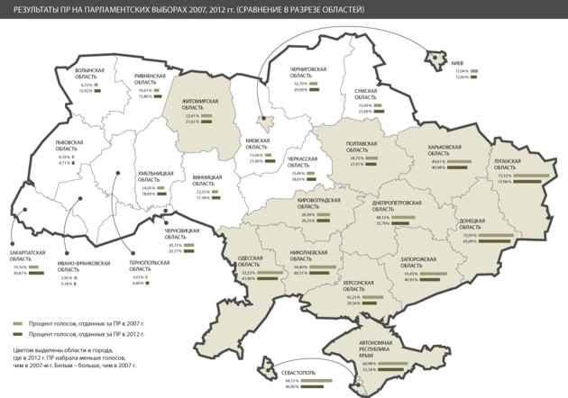 А пока посмотрим на карту. В двенадцати (!) областях, а также в Киеве и Севастополе ПР заметно сдала свои позиции. Весь изюм в том, что речь идет преимущественно о материнских регионах партии власти — востоке, юго-востоке и юге: Донецкая область — минус семь процентов, Луганская — почти 17%, Харьковская — девять, Запорожская — 15%, Херсонская —14%, Николаевская —14%, Крым — минус восемь. Потеряли регионалы и в центре — в Полтавской и Кировоградской областях.