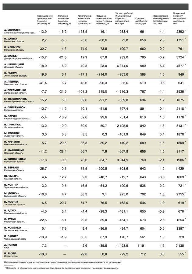 Безусловно, особого «покращення» в вышеперечисленных областях — кандидатах на серьезные кадровые ротации — не случилось ни вчера, ни сегодня. Но ведь не наблюдается экономического чуда и обещанных реформ и в других провалившихся электоральных вотчинах ПР. Так, Донецкая область — рекордсмен по убыткам — 6 (!) млрд. грн. В затылок губернатору А.Шишацкому дышит луганский «керманич» В.Пристюк (более 2 млрд. грн. убытков) с ростом безработицы и падением производства; следом — А.Попов со столичными убытками почти в полтора миллиарда гривен и снижением более чем на 30% строительства жилья (и это в сравнении с результатами «деятельности» Черновецкого); Запорожская область — 1 млрд. 316 млн. грн. (губернатор А.Пеклушенко также не сильно увлекается инвестициями, снизив их на… 100%); Крым Могилева — почти миллиард убытков в промышленном производстве на фоне рекордного роста безработицы. Тем не менее им каким-то образом удалось не попасть в черный список Януковича. Так же, как и руководителям областей-аутсайдеров — Закарпатской (А.Ледида), Ривненской (В.Берташ), Хмельницкой (В.Ядуха) и Черкасской (С.Тулуб).