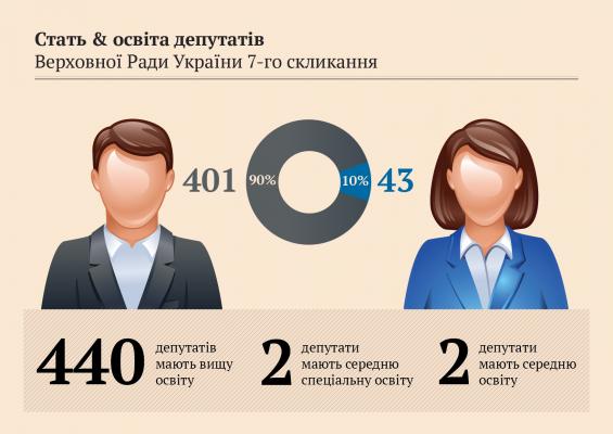 Серед 444 депутатів Верховної Ради 440 обранців або ж 99% мають вищу освіту. В досьє інших двох вказано, що вони мають загальну середню (Мустафа Джемільов, ВО «Батьківщина», Світлана Фабрикант, Партія регіонів), і ще у двох – середню (свободівці Анатолій Вітів і Олександр Мирний).