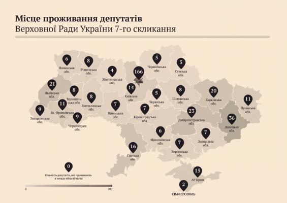 Найбільше обранців місцем свого проживання вказали Київ – 166 осіб (37,39 %). Донецьк та область представлені 36 парламентарями. Крім того, у Донецькій області найбільша кількість одномандатних мажоритарних округів – 21 (8,11 %).